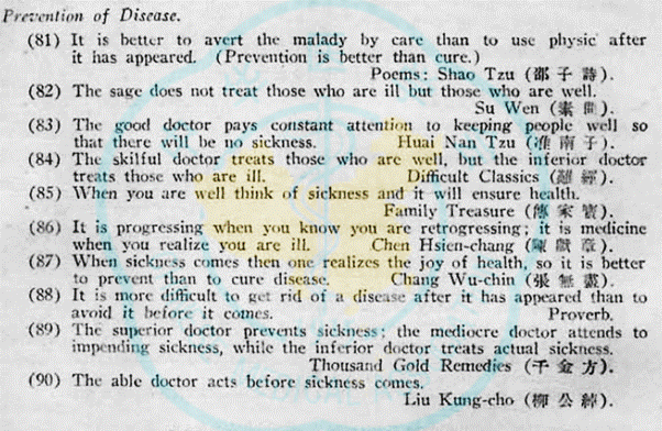 Turns out, it’s a long time. As is often the case, some of the earliest examples come from China. One of the best known is “the superior doctor prevents sickness; the mediocre doctor attends to impending sickness; the inferior doctor treats actual sickness”. The quote is sometimes attributed to the Huangdi Neijing, a foundational Chinese medical text compiled sometime between the 4th century BCE and 3rd century AD, but is more often considered simply an ancient proverb. In his 1926 collection of papers for the Chinese Medical Journal on Chinese medical sayings and proverbs, K. Chimin Wong attributed the quote to another text, Sun Simiao’s Beiji qianjin yaofang (“Essential Formulas Worth a Thousand in Gold for Emergencies”) published in 652. Either way, it’s old. Wong collates various other sayings on preventative medicine (see below), but elsewhere also on diet, exercise and moderation.